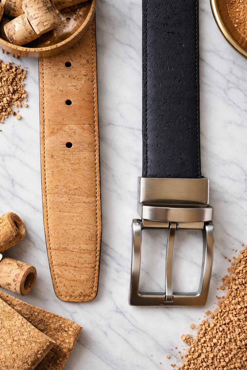 Cork reversible belt. Can be used in the natural or blue cork color, with metal buckle.